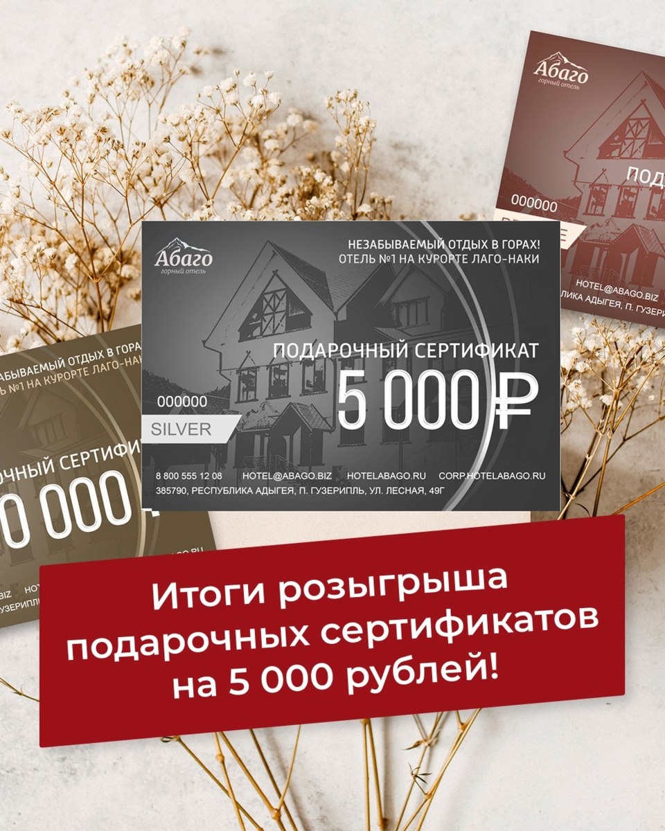Итак, в честь дня рождения отеля "Абаго" мы дарим сертификаты на 5000 рублей следующим победителям: