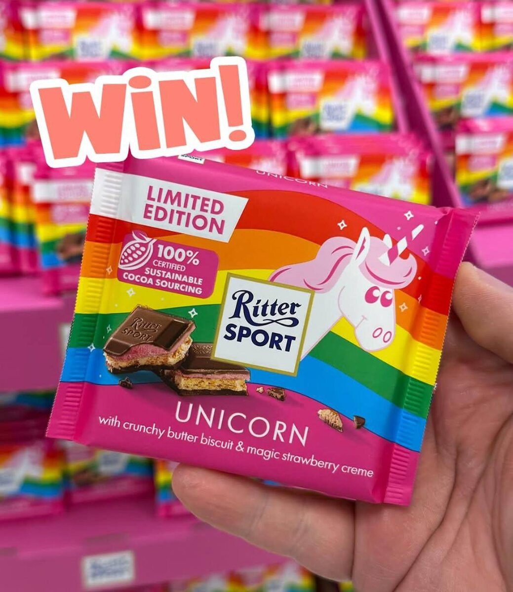 Прикол, радужную шоколадку выпустил Ritter Sport — это лимитка с хрустящим молочным бисквитом и волшебным клубничным кремом.