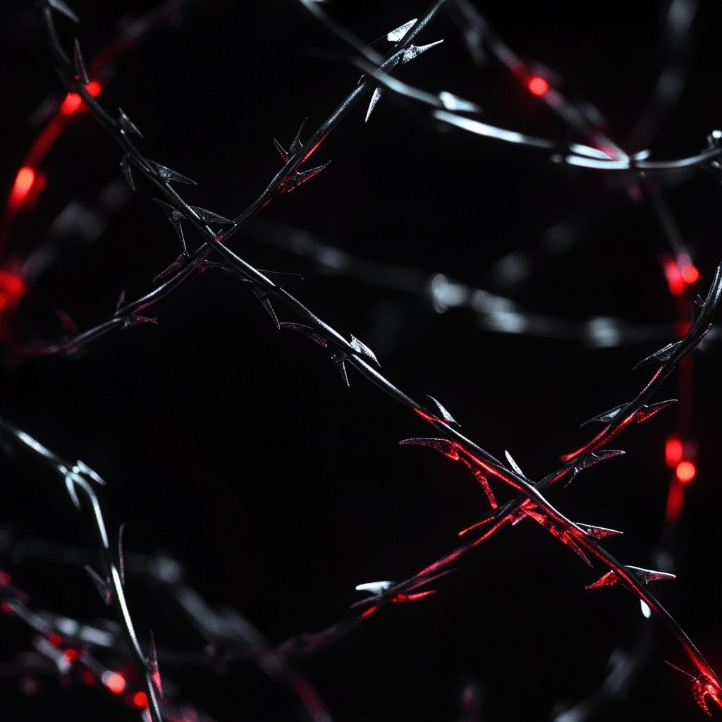 Создано на основе запроса: an abstract silver barbed wire on a black background with some red light reflects