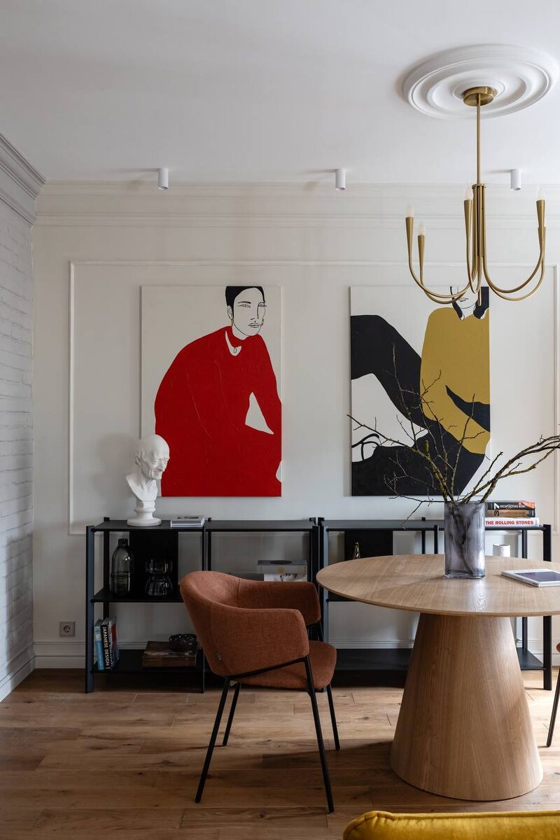 В кухне и гостиной стены приглушенных тонов служат идеальным фоном для диалога форм. Широкий карниз С332 мягко отделяет плоскость стены от потолка, создавая эффект «парящего» перехода.