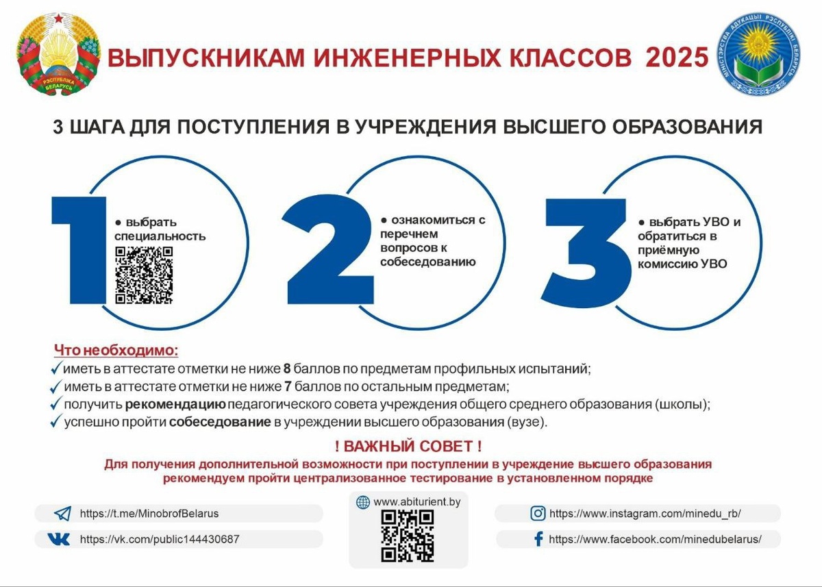 ❗️Выпускникам инженерных классов 2025 🔵 Министерство образования Республики Беларусь подготовило специальную инфографику для выпускников инженерных классов 2025 года. 📍 В 2025 году выпускники профильных классов (групп) инженерной направленности могут быть зачислены в число студентов Белорусско-Российского университета без вступительных испытаний по результатам собеседования на следующие специальности: Автомобили, тракторы, мобильные и технологические комплексы, Эксплуатация наземных транспортных и технологических машин и комплексов, Автоматизация технологических процессов и производств,Технология машиностроения, металлорежущие станки и инструменты, Инженерно-техническое проектирование и производство материалов и изделий из них, Производство изделий на основе трехмерных технологий, Строительство зданий и сооружений, Информационно-измерительные приборы и системы. #абитуриенту