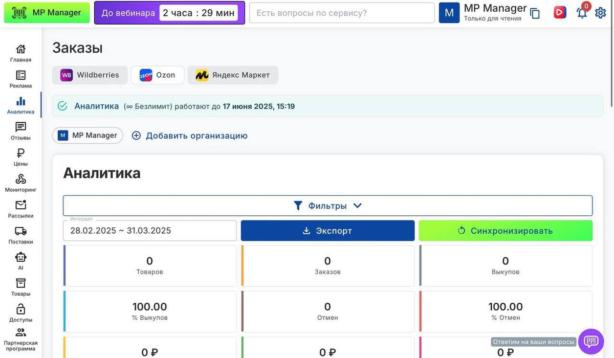 Теперь на странице Аналитика → Заказы появилась синхронизация, выбор интервала и перезапрос, аналогично тому, как это реализовано на Wildberries.