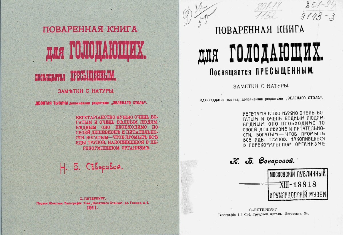 Нашла для вас еще одну интересную книгу 1911 года: Н. Б. Нордман-Северова. Поваренная книга для голодающих. Посвящается пресыщенным. СПб., 1911. Издание представляет собой одну из первых российских вегетарианских поваренных книг. Эту книгу составила владелица усадьбы Пенаты, вторая жена художника И. Е. Репина Наталья Борисовна Нордман (Северова). Она была известной последовательницей вегетарианства, активной участницей движения за права женщин. В книге представлены как рецепты, так и рассуждения автора на тему вегетарианства. «Вегетарианство нужно очень богатым и очень бедным людям. Бедным оно необходимо по своей дешевизне и питательности. Богатым — чтоб промыть все яды трупов, накопившиеся в перекормленном организме», — читаем уже на обложке. Да и в целом стиль изложения отличается, как сказал бы современник Нордман-Северовой, недюжей мощью, остротою и нахрапистостью. В тексте много восклицательных знаков, риторических вопрошаний, эмоциональных диалогов и поучительных историй. «Какие