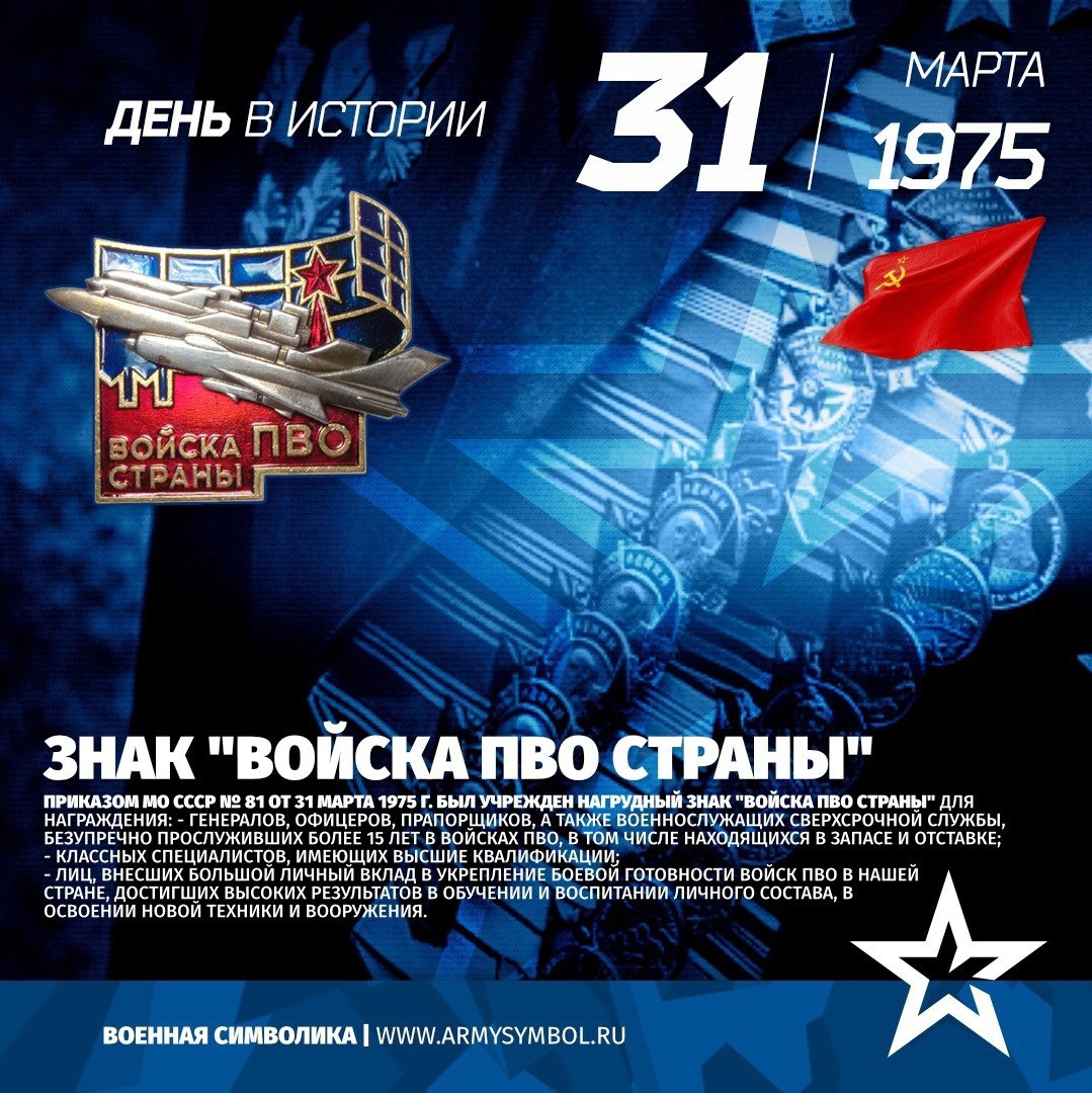 Учрежден знак «Войска ПВО страны» Приказом МО СССР № 81 от 31 марта 1975 г. был учрежден нагрудный знак "Войска ПВО страны" для награждения: - генералов, офицеров, прапорщиков, а также военнослужащих сверхсрочной службы, безупречно прослуживших более 15 лет в Войсках ПВО, в том числе находящихся в запасе и отставке; - классных специалистов, имеющих высшие квалификации; - лиц, внесших большой личный вклад в укрепление боевой готовности Войск ПВО в нашей стране, достигших высоких результатов в обучении и воспитании личного состава, в освоении новой техники и вооружения. Многоугольник с изображением красной эмалью фрагмента стены Московского Кремля и одной из его башен, над которыми развернута антенна радиолокационной станции дальнего обнаружения. Лицевая ее часть покрыта голубой эмалью, а видимая часть оборотной стороны — синей. На их фоне крепится серебристая накладка с устремленным Показать полностью... Подпишитесь на наши группы ВКонтакте и в Одноклассниках - читайте, смотрите и ко