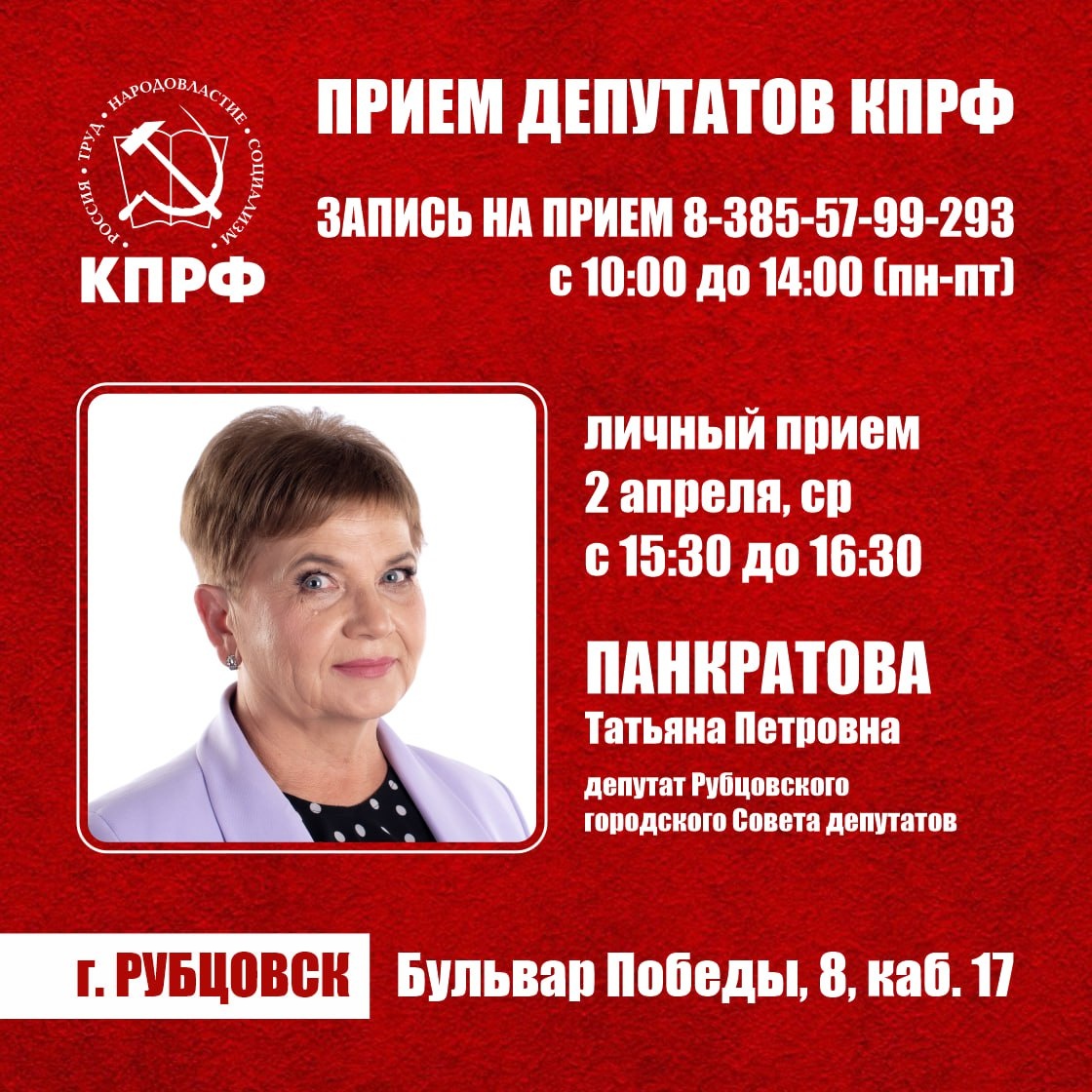 ⚡️Приемные дни депутатов Алтайского краевого Законодательного Собрания по адресу: г. Рубцовск, Бульвар Победы, 8, каб. 17 тел. 8-385-579-92-93 📌2 апреля, ср, с 15:30 до 16:30 ПАНКРАТОВА Татьяна Петровна депутат Рубцовского городского Совета депутатов
