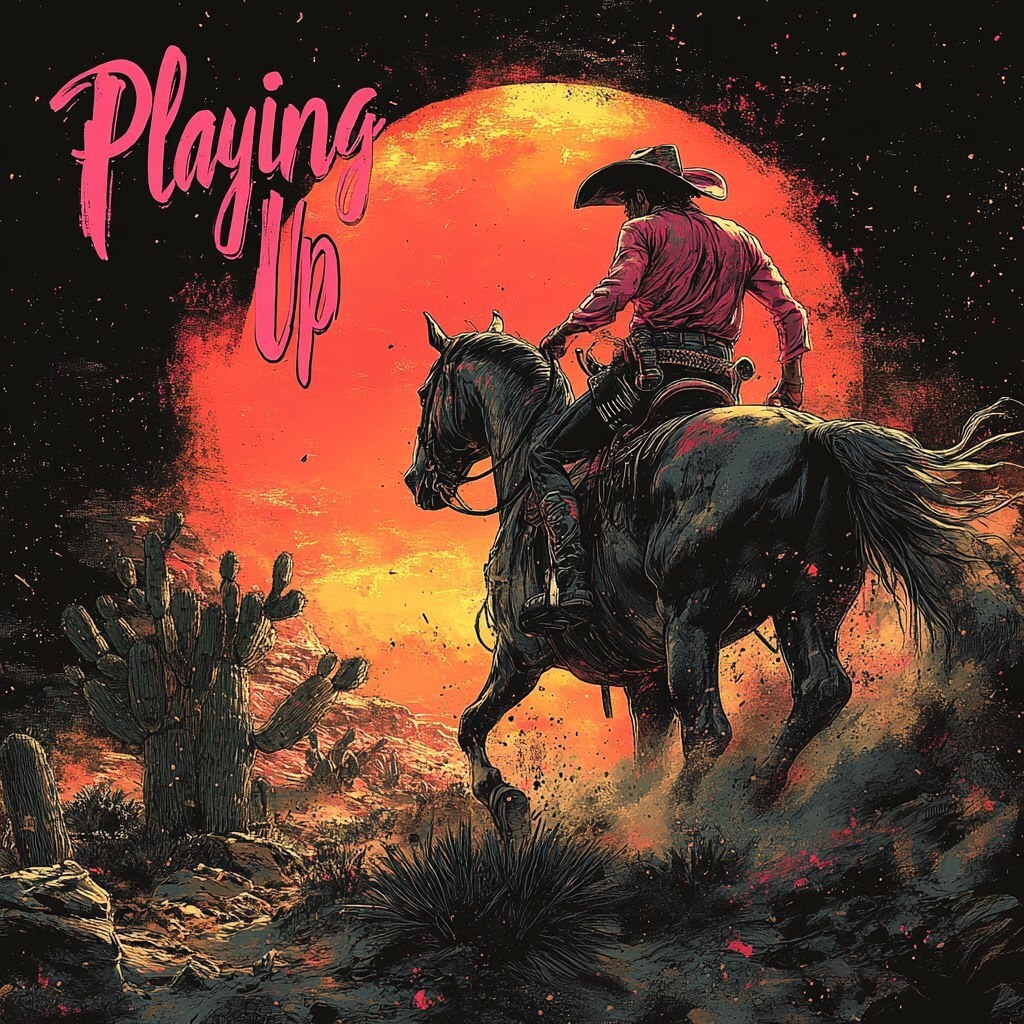 Создано на основе запроса: Against a black background, the words "Playing Up" are written on the left in a smooth, pink, handwritten - style font. On the right is a pattern of a cowboy riding a horse. The cowboy is wearing a cowboy hat and decorated clothing, with both arms spread open in a flamboyant pose. The background is a Western desert scene with cacti and an orange - red setting sun, creating a dynamic and unruly Western atmosphere.