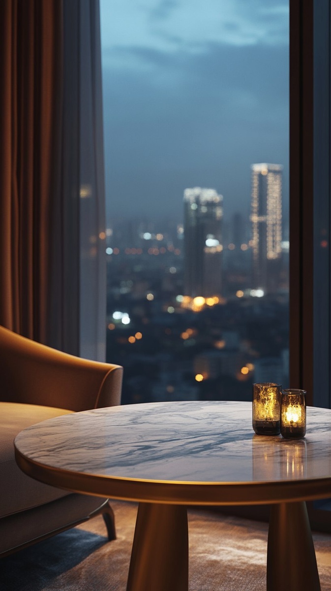 Создано на основе запроса: luxury hotel room, marble table, gold accents, silk curtains, elegant furniture, soft lighting, large window, panoramic night city view, muted color palette, refined interior design, plush textures, minimalist decor, cinematic atmosphere, soft shadows, moody highlights, realistic style, vertical composition, high-end lifestyle, peaceful ambiance,