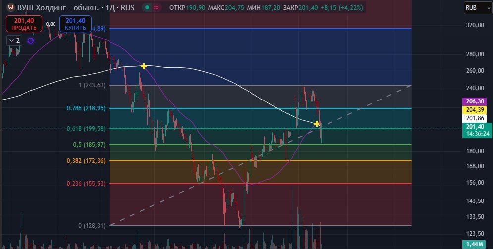 📉По Фибо скорректировался до 50%- 187 руб, То есть даже ниже, чем я предполагала.
