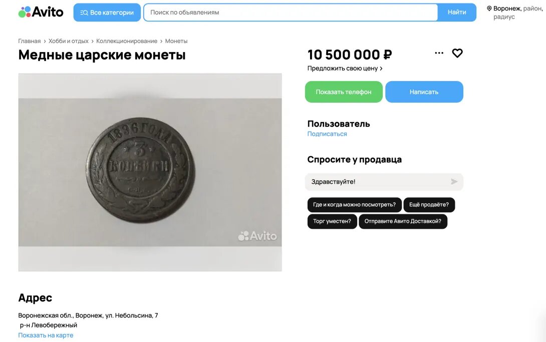 Старинную монету царских времен продают в Воронеже. Объявление появилось на днях на сайте «Авито». Стоимость лота составляет внушительные 10,5 млн рублей, на продажу его выставил продавец из Левобережного района. Из текста объявления следует, что номинальная стоимость монеты всего три копейки, выполнена она из меди. «Возраст» монетки внушительный – около полутора веков, она датируется 1869 годом выпуска. А на прошлой неделе мы рассказывали про еще одну любопытную находку с «Авито». Один из горожан на продажу выставил оригинальный (по заверениям продавца) автограф американской актрисы Памелы Андерсон. За роспись звезды «Спасателей Малибу» просят максимально скромные 7,5 тыс. рублей. Фото – «Авито». Не пропустить важное в ДЗЕН 36ON