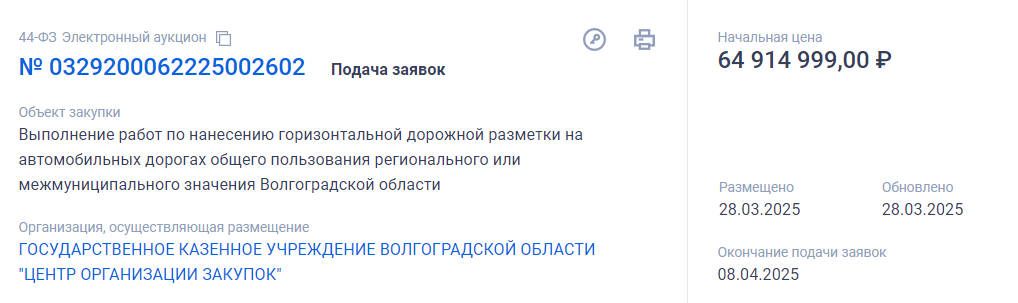 В роли заказчика выступило региональное госучреждение «Волгоградавтодор». Соответствующий электронный аукцион был размещен на портале «Госзакупки» накануне. Согласно документации, подрядчик должен выполнить работы с момента заключения контракта и до 20 декабря текущего года. Известно, что дорожные разметки нанесут на автомобильных дорогах общего пользования регионального или межмуниципального значения.