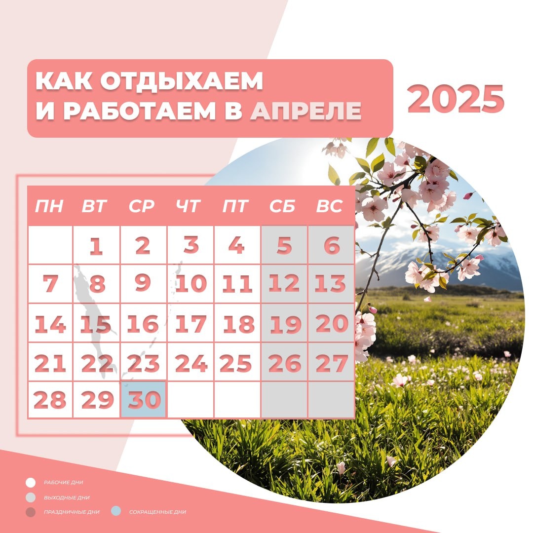 Друзья, вот и наступил долгожданный момент — завтра наступает новый месяц весны - апрель! 🌱 😉Всего нас ожидает 22 рабочих дня, из которых один выпадает на предпраздничный день — 30 апреля. Это означает, что мы можем эффективно распределять силы и успеть завершить все важные дела до майских праздников! Кто уже строит планы на выходные? Поделитесь идеями в комментариях! 😊 #сахалинскаяобласть #сахалин #календарьсобытий
