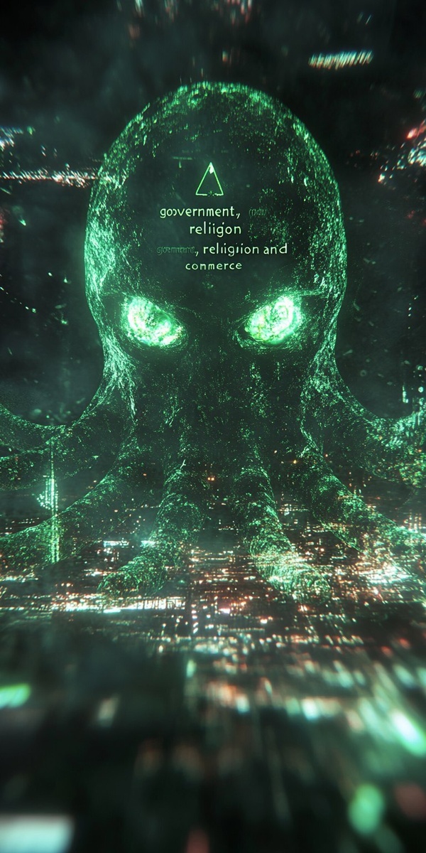 Создано на основе запроса: "government, religion and commerce " the diabolical system of robot suction tentacles used to control humanity