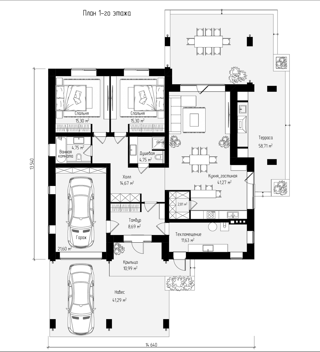 - Два парковочных места. Одно из них расположено в гараже внутри дома, второе – рядом под навесом. Решение вынести одно парковочное место за пределы дома обусловлено стремлением сохранить как можно больше полезной площади жилья.