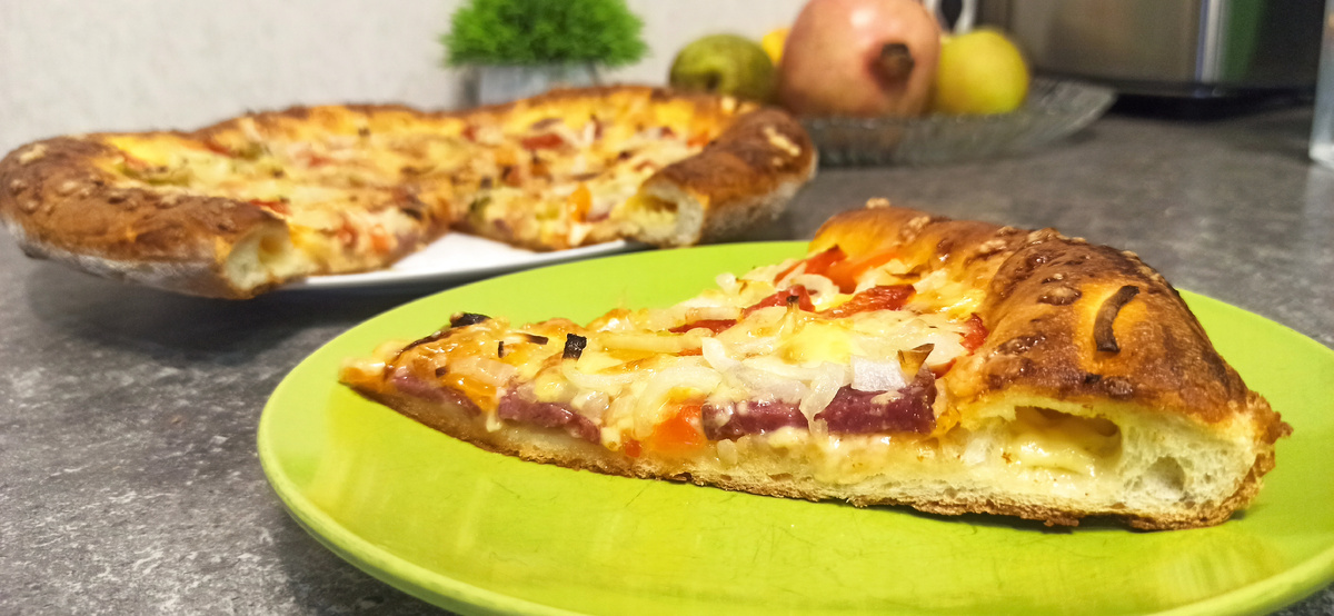 В теплой воде растворяем сахар и дрожжи, оставить на 10 минут. Добавляем соль, масло и частями всыпаем муку. Вымешиваем эластичное тесто и оставляем его в тепле на 40–60 минут. 2️⃣ Подготовка продуктов Пока тесто подходит, нарезаем колбасу, перец болгарский и лук полукольцами. Сыр для бортиков нарезаем небольшими брусочками, остальной сыр трем на крупной терке. 3️⃣ Сборка пиццы Тесто раскатываем и выкладываем по его периметру брусочки сыра. Тесто заворачиваем краями внутрь и тщательно защипываем, как показано на фото. Прямо на основу наливаем кетчуп и майонез и размешиваем соус по основе для пиццы. Не забываем промазать бортики! После этого выкладываем слоями начинку: немного натертого сыра, колбаса, перец, лук, сно