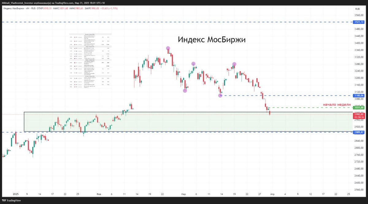 Индекс в моменте -1%. При этом пробили уровень 3000. Тут прям широкая зона поддержки ниже 2889-3000. Думаю что тут как минимум временно задержимся.