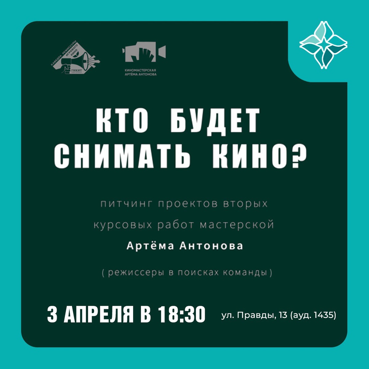🎬🎥 Готовы увидеть будущее кино? 🎬🎥 Приглашаем всех на питчинг проектов вторых курсовых работ мастерской Артёма Антонова! 🤩 📅 Когда: 3 апреля 🕕 Во сколько: 18:30 📍 Где: аудитория 1435 (ул. Правды, 13) Вас ждут свежие идеи, креативные концепции ✨ Вход свободный для студентов и сотрудников института. ВНИМАНИЕ! ⚠️ Если вы не являетесь студентом или сотрудником, не забудьте оформить разовый пропуск, чтобы попасть на мероприятие. Просто перейдите по ссылке и получите QR-код: qr.gikit.ru/ Не упустите возможность заглянуть за кулисы кинопроизводства и поддержать начинающих кинематографистов! Будет интересно! 😉 #кино #питчинг #гикит #артемантонов #студенты #проекты #творчество #санктпетербург #spb
