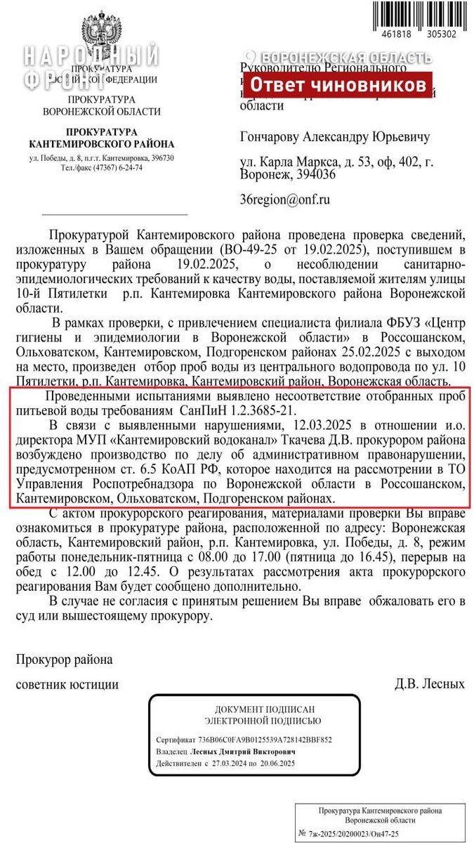 Проблема с качеством воды в Кантемировке. Прокуратура подтвердила информацию о том, что жители Кантемировки вынуждены использовать воду, которая не пригодна для приготовления пищи и питья. Такие выводы были сделаны в результате прокурорской проверки, в ходе которой привлекались эксперты Центра гигиены и эпидемиологии Воронежской области. Все отобранные образцы водопроводной воды оказались не соответствующими санитарным нормам. В связи с этим в отношении директора муниципального предприятия "Кантемировский водоканал" было возбуждено административное дело. Ранее представители Народного фронта сообщали, что жители Кантемировки сталкиваются с проблемой некачественной водопроводной воды, содержащей высокие уровни железа и других вредных примесей, а также обладающей неприятным запахом. Роспотребнадзор уже направлял предупреждение коммунальным службам, однако ситуация не изменилась. Люди обратились с жалобами на прямую линию президента, в результате чего прокуратура была привлечена к решен