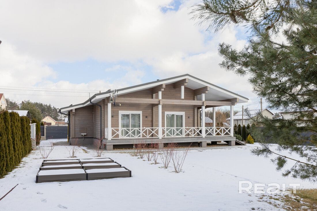 В поселке Городище, что недалеко от Минска, выставлен на продажу новый бревенчатый дом с большой террасой. Внутри он отделан деревом, там обустроено несколько комнат, есть коммуникации. Размеры участка позволяют организовать дополнительные зоны отдыха. Посмотрите, как выглядит дом. Пишем и про его стоимость. Дом построен в один этаж в 2022 году в поселке Городище. Фундамент — монолитный железобетонный с утеплением и гидроизоляцией. Стены из профилированного бруса. На крыше лежит металлочерепица. Кровля также утеплена. Площадь жилья составляет 107,6 м². Из этого 75,4 м² — жилая. Внутри дом отделан деревом. Самая большая комната — совмещенная кухня-гостиная. Потолок имеет разную высоту, что позволяет повесить высокие люстры. Продумано несколько вариантов освещения. В зоне кухни лежит плитка, в жилой части — паркетная доска. Все обставлено мебелью и техникой. Обеденный стол стоит рядом с двумя большими окнами. Отсюда же можно выйти на террасу. В доме две отдельные жилые комнаты. Санузел