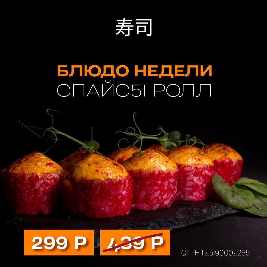 Спайс51 ролл доступен за 299Р вместо 439Р! 🎉 Состав: рис 🍚, нори 🌿, краб снежный 🦀, сыр творожный 🧀, огурец 🥒, соус спайси 🌶️, соус унаги 🍯, кунжут микс. 8 шт / 240 гр. не более 1 позиции на чек и гостя. ❗ *не суммируется со скидками, списанием бонусных средств, иными подарками, блюдами за баллы чибис. ⏳ Сроки 31.03.2025 - 06.04.2025 гг. ВК DLVRY 📲 https://vk.com/app6408974_-95602806#/actions/17388985