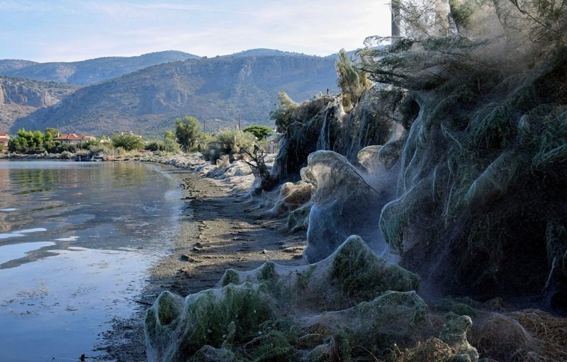 В городе Айтолико, на западе Греции, береговую линию оккупировали пауки в невероятных количествах, раскинув свою паутину. Из-за небывалого нашествия членистоногих, побережье теперь напоминает скорее не место отдыха, а фильм ужасов. Это не просто ниточки ,которые можно легко смахнуть,здесь все увито их паутиной. Специалисты говорят, что теплые погодные условия сначала способствовали размножению мошек и других мелких насекомых, и как следствие — пауков. Пауки-тетрагнатиды, как известно науке, способны строить огромные гнезда для спаривания, и часто делают это у водоемов. Их паутина очень плотная, и попавшее в нее насекомое не имеет ни малейшего шанса выжить. Местные жители и туристы были напуганы - такое не каждый день происходит! Однако эксперты уверяют, что причин для волнений нет. Паутина и сами пауки не опасны для людей, и не приносят никакого ущерба окружающей среде. Как только изменится погода, пауки исчезнут. Биолог Мария Чацаки рассказала - "Высокая температура, влажность и