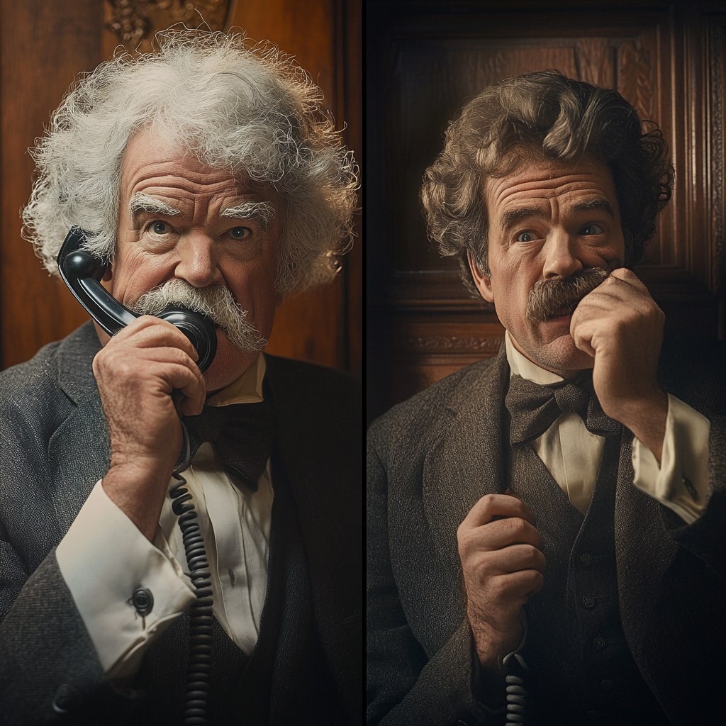 Создано на основе запроса: Mark Twain on the telephone, smirking as he pulls a prank. On the other end, a confused Victorian gentleman holding the receiver, puzzled expression. Split-screen composition, vintage realism, warm lighting, cinematic shot.