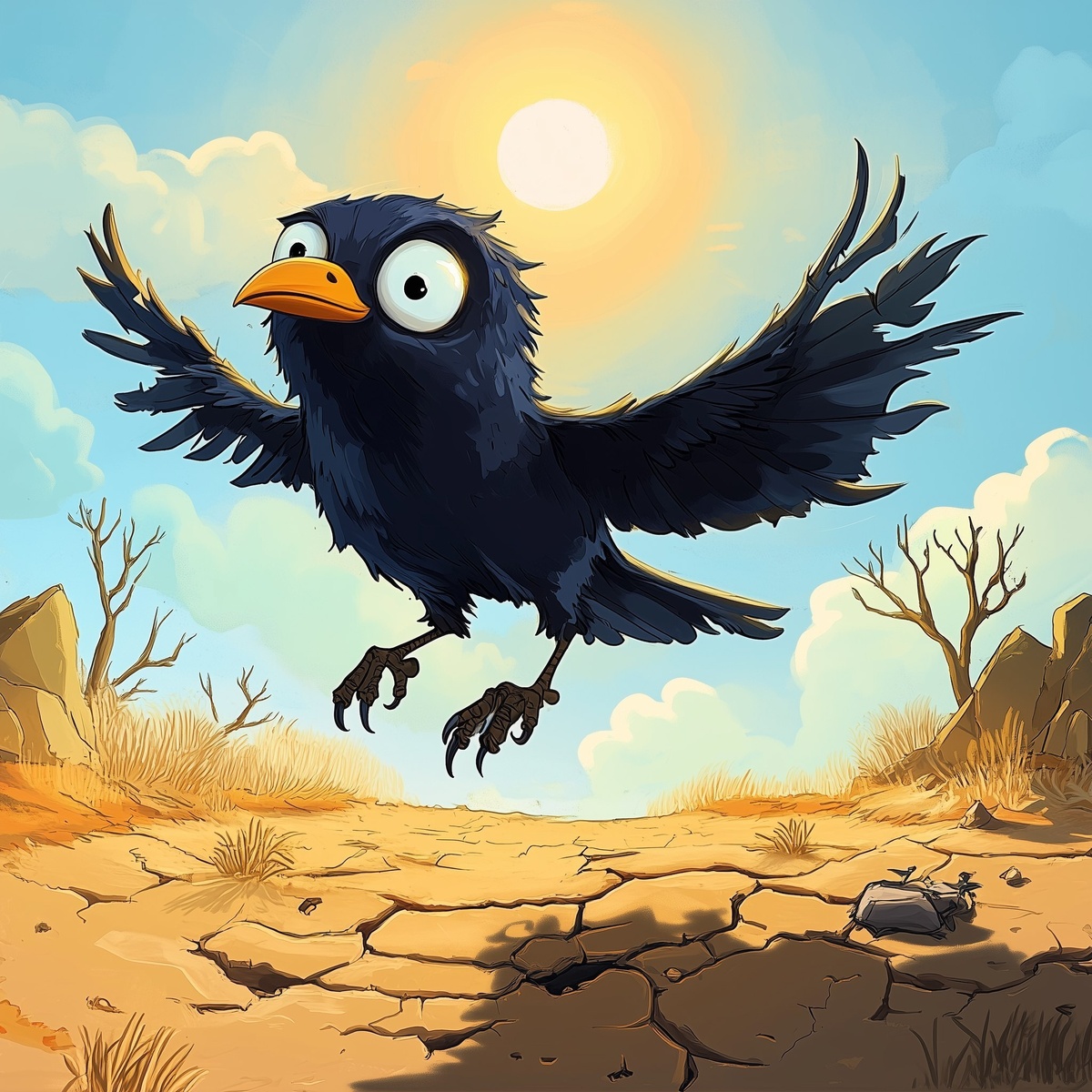 Автоперевод: Черная ворона в стиле мультфильма с большими выразительными глазами, летящими на сухую, потрескавшуюся землю, яркое солнце, сияющее в голубом небе, несколько засохших деревье