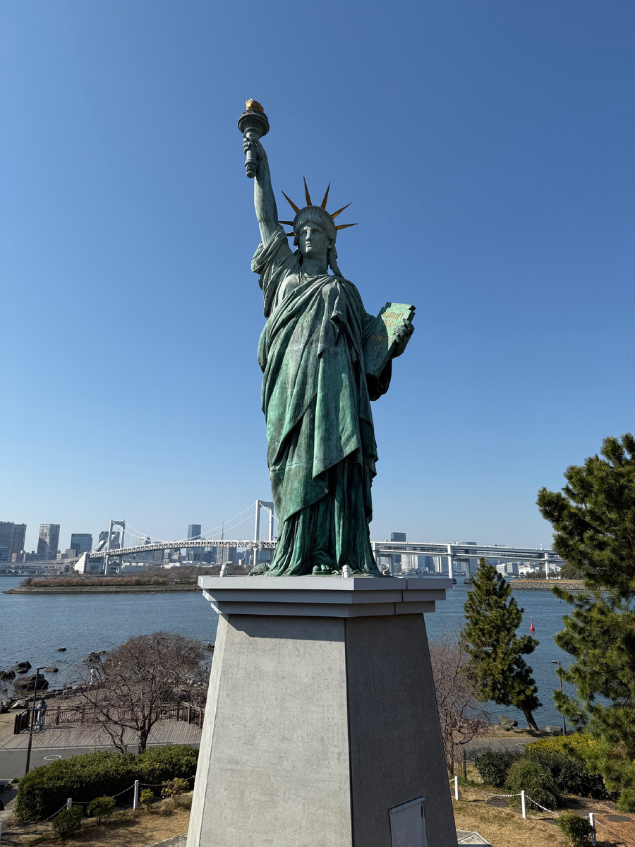Одайба: день на искусственном острове Сегодня мы отправились в район Одайба, расположенный на искусственном острове. Это место — настоящая находка для туристов: здесь и современная архитектура, музеи и потрясающие виды! 🚇 Дорога до Одайбы: - Мы ехали на ветке Юрикамоме (Yurikamome). Это автоматическое метро без машиниста, которое проходит по высокому мосту над заливом. Из вагона открывается восхитительный вид на город, залив и даже на статую Свободы (да, в Токио тоже есть своя статуя Свободы, только поменьше). 🗽 Статуя Свободы: В Одайбе стоит мини-копия нью-йоркской статуи Свободы. Она расположена у набережной и отлично смотрится на фоне небоскрёбов и моста Rainbow Bridge. 🌧️ Погода: - К сожалению, сегодня нам не повезло с погодой. Ветер дул так, что казалось, будто нас вот-вот унесёт, а дождь моросил весь день. Но это не испортило настроения! ✈️ Больше путешествий здесь: