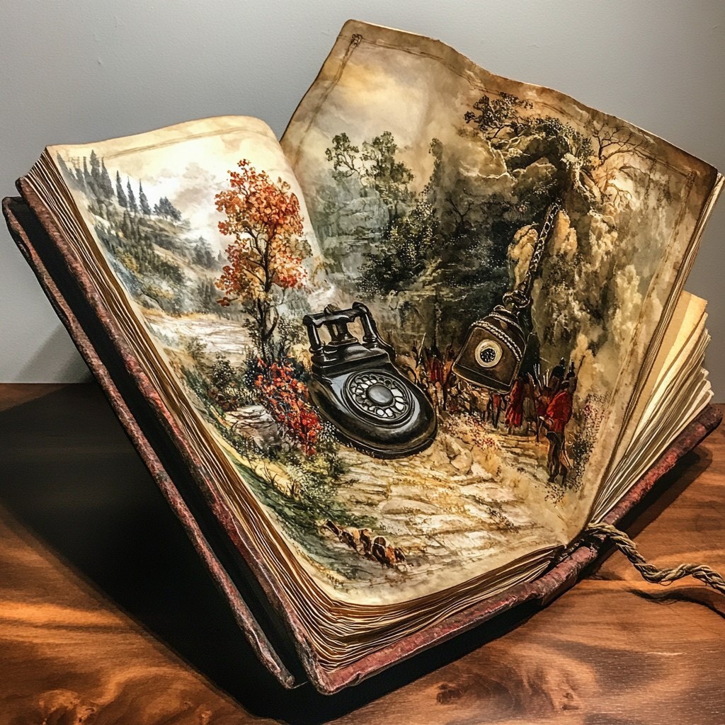 Создано на основе запроса: An open book of ‘A Connecticut Yankee in King Arthur’s Court,’ an illustrated scene depicting a telephone being used in a medieval setting. The mix of old and new, a fantastical yet historical blend, intricate details, warm lighting.