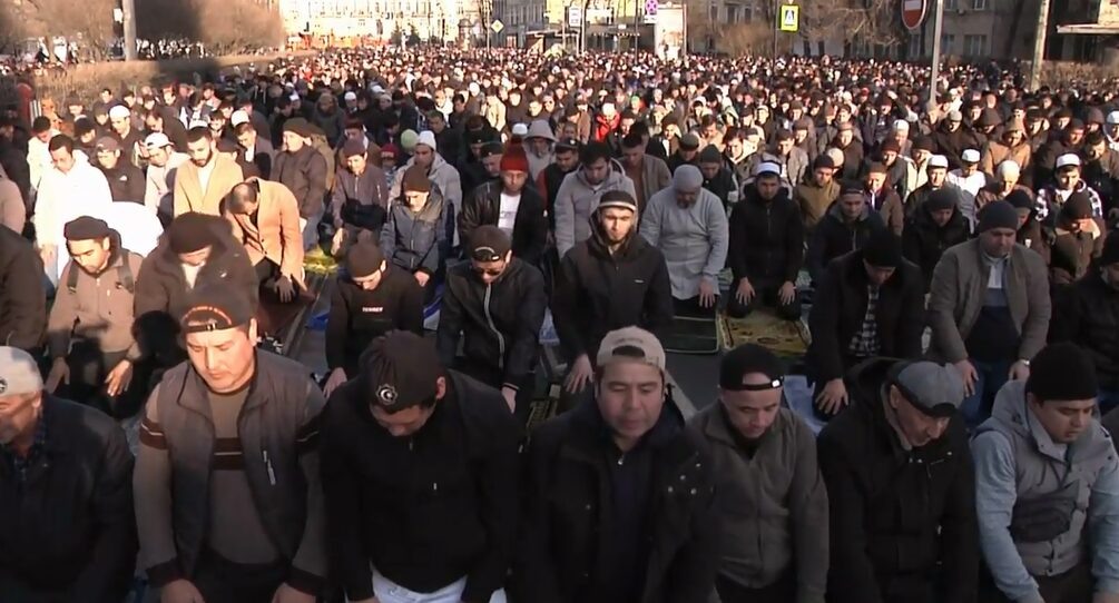 Верующие совершили праздничную молитву в честь Ураза-байрама в Санкт-Петербурге