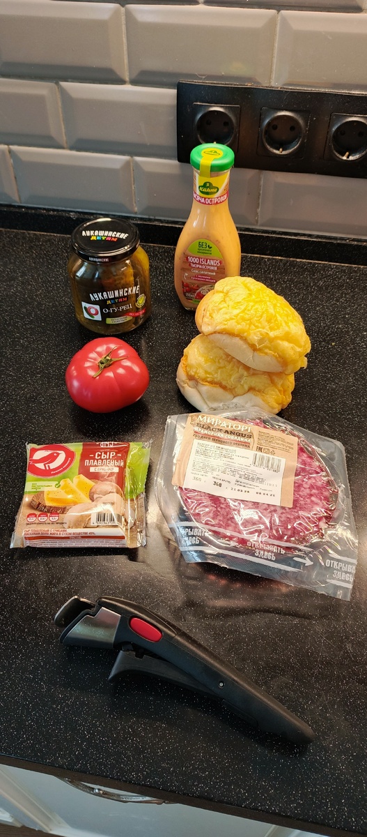 На этом фото спонтанными стали большие круглые булочки с сыром из Ашана, что повлекло за собой покупку котлет для бургеров, кстати шикарные, вот эти, пожалуй, лучшие на рынке, при этом если вы заказываете где то в ресторане бургер за 750 рублей, то где то 80% что это окажется именно эта котлета от Мираторга))) 250 дней зернового откорма, состав - говядина.))) Понятно, что щас будет Бутерброд, по английски, Бургер. На Оскар не претендую, но по домашнему чётко, сочно, вкусно замучу))) Для начала прям обдать жаром, на очень разогретой сковороде по 30 сек с каждой стороны. Потом уходим на минимальный режим и ждём прозрачного сока, ТуТ вот ещё мутнокровавый) В параллель всё нарезаеЦа, открывается... Соус в моём понимании, больше для булки, мясо у меня и так будет сочное, плюс именно оно должно плавить сыр и сверху и снизу, так что да соус у меня и там, и там соприкасается с булкой, а мясо изолировано сыром. Ещё нюанс, огурчик маринованный, он для водки, ну для закуски типа, а ТуТ ни чего