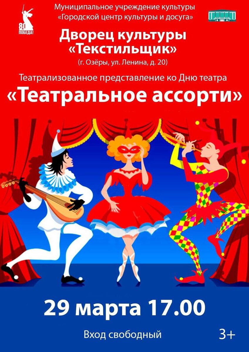 🙋♀Театрализованное представление, посвящённое Всемирному дню театра Этот праздник объединяет актеров, режиссеров, драматургов, зрителей и всех, кто связан с театральной жизнью. Он напоминает о важности творчества, которое способно вдохновлять, объединять и менять мир. Впервые День театра отметили 27 марта 1962 года, и с тех пор это стало ежегодной традицией. В этот день по всему миру проходят театральные события и мероприятия. Проводятся встречи с актёрами, тематические фестивали, мастер-классы, лекции и дискуссии. В «Театральном ассорти» примут участие творческие коллективы «Маскарад», «Пилигримы», «Синяя птица», «Театр для всех» Городского центра культуры и досуга. Взрослые и дети представят на сцене ДК «Текстильщик» зарисовки, миниатюры, отрывки из спектаклей, стихи и прозу. Вход свободный Дата: 29 марта в 17:00 Место: ДК «Текстильщик», г. Озёры, ул. Ленина, д.20