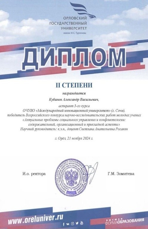 Аспирант Международного инновационного университета Кубинев Александр Васильевич награжден дипломом III степени как победитель Всероссийского конкурса научно-исследовательских работ молодых ученых «Актуальные проблемы социального управления и конфликтологии: содержательный, организационный и прикладной аспекты» по научным руководством кандидата экономических наук, доцента Роганян Светланы Анатольевны.