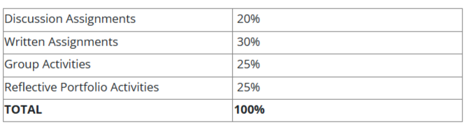 Most units in this course require that you complete a Written Assignment, which may come in many forms (case study, research paper, etc.). You are required to submit your assignments by the indicated deadlines and, in addition, to peer assess three (3) of your classmates’ assignments according to the instructions found in the Assessment Form, which is provided to you during the following week. During this peer assessment period, you are expected to provide details in the feedback section of the Assessment Form, indicating why you awarded the grade that you did to your peer. Please note that each assignment grade is comprised of a combination of your submission (90%) and your peer assessments (10%). Failure to submit Written Assignments and/or Assessment Forms may result in failure of the course.