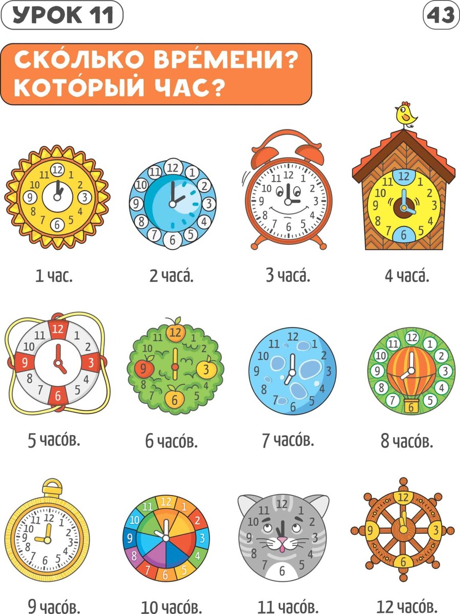 Сорока написана для детей. Для меня было главное – не напугать ребенка грамматикой.Я также знаю, что если даже ребенок знает правила, то это не значит, что он может их выполнять. Поэтому у меня другой подход – в Сороке мы изучаем ситуацию, под ситуацию подбираем слова и грамматику. Например, возьмем тему «Согласование количественных числительных с существительными». Это страшно звучит даже для взрослого! Если же мы возьмем маленький кусочек этой темы: два часа, три часа, четыре часа, то уже как-то приятнее становится. Выучили и попрактиковали всего 4 слова: числительные два, три, четыре и слово часа. Выучили и попрактиковали их сочетания. Я напоминаю, что в Сороке мы каждую форму слова изучаем как отдельное слово. Попрактиковали словосочетания, чтобы запомнить получше. Учебник Сорока 1 страница 43