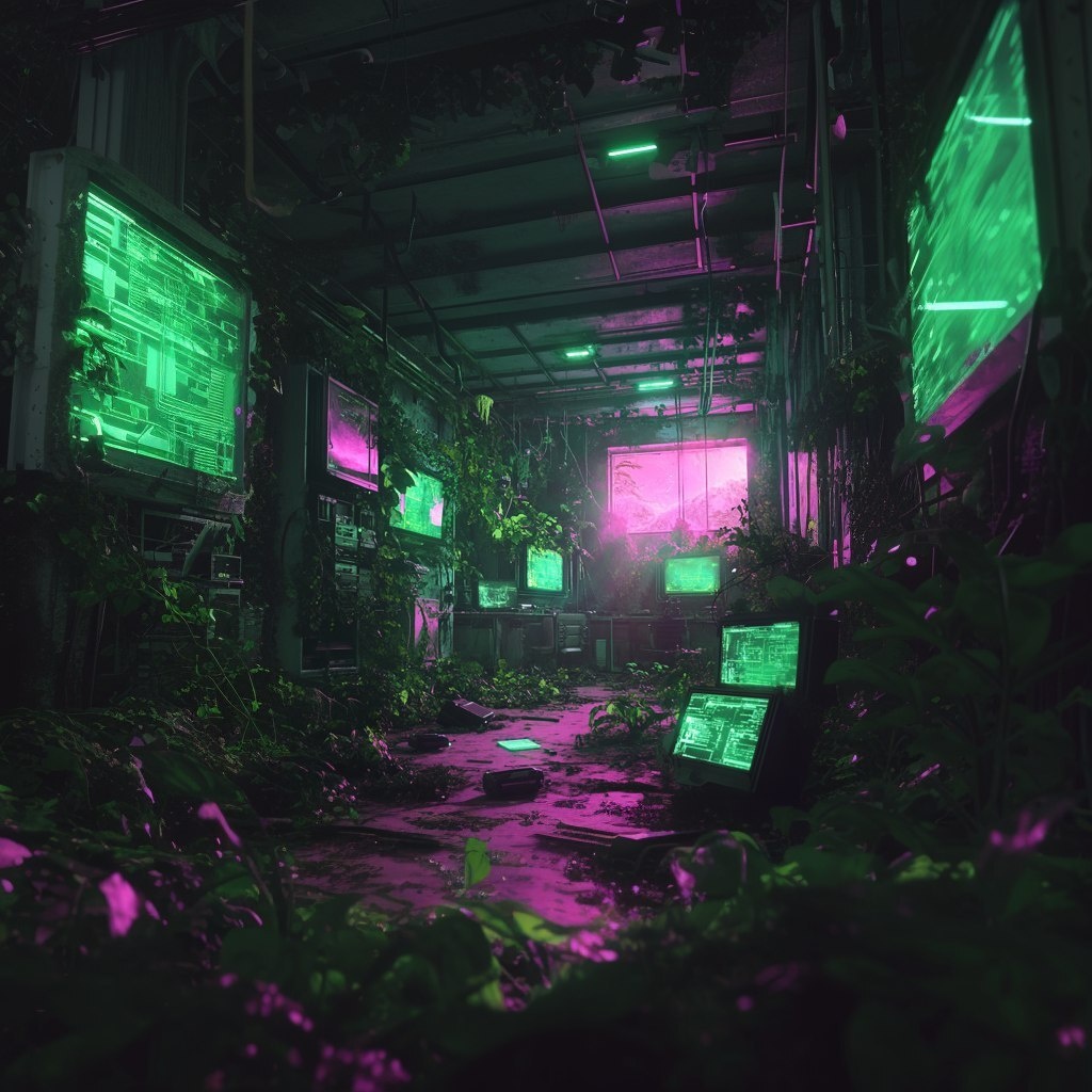 Создано на основе запроса: abandoned biotech lab overgrown with alien flora, glowing green and pink light diffused through haze, broken monitors, flickering holograms, retro-futuristic style, 90s sci-fi poster aesthetic