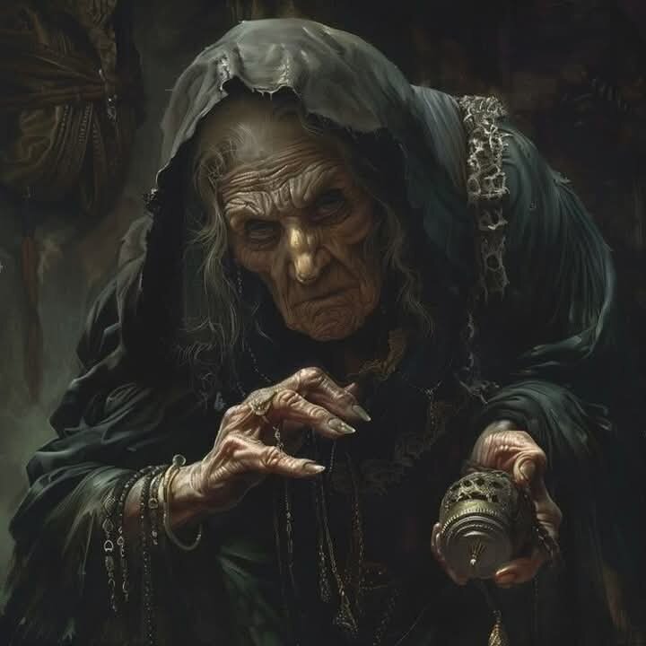 Невысокая сгорбленная старушка ловко срыгнула с печи на пол, и, держась одной рукой за поясницу, а другой – за клюку, медленно пошла к гостю навстречу. И чем ближе она подходила к Ивану, тем сильнее его охватывал ужас: длинный горбатый нос, больше похожий на орлиный клюв, впалые глаза, копна седых волос, похожая на солому, и большой желтый клык, выглядывающий изо рта, заканчивающийся над верхней губой и совсем чуть-чуть не достающий до носа.