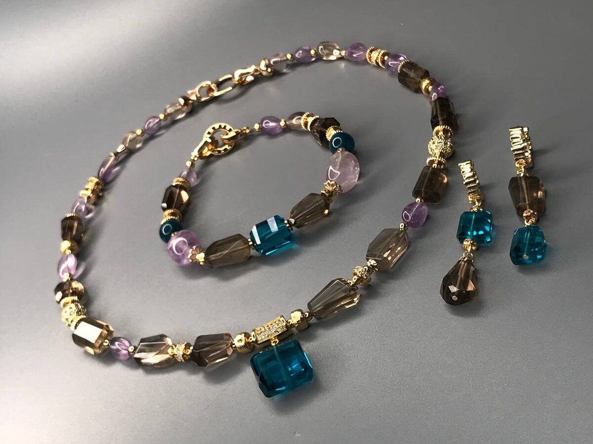 Раухтопазы, лавандовые аметисты, голубая шпинель - микс этих минералов создали искристую радугу в сдержанных и спокойных тонах. Обратите внимание на серьги, они отлично сбалансированны не только по цвету, но и по размеру камней. Сидят идеально! Комплект из 3-х украшений (колье, браслет и серьги) можно приобрести как вместе, так и по отдельности. Связаться и обсудить камни, заказать украшения можно по ссылке: @DiDi_Jewelry Di-Di