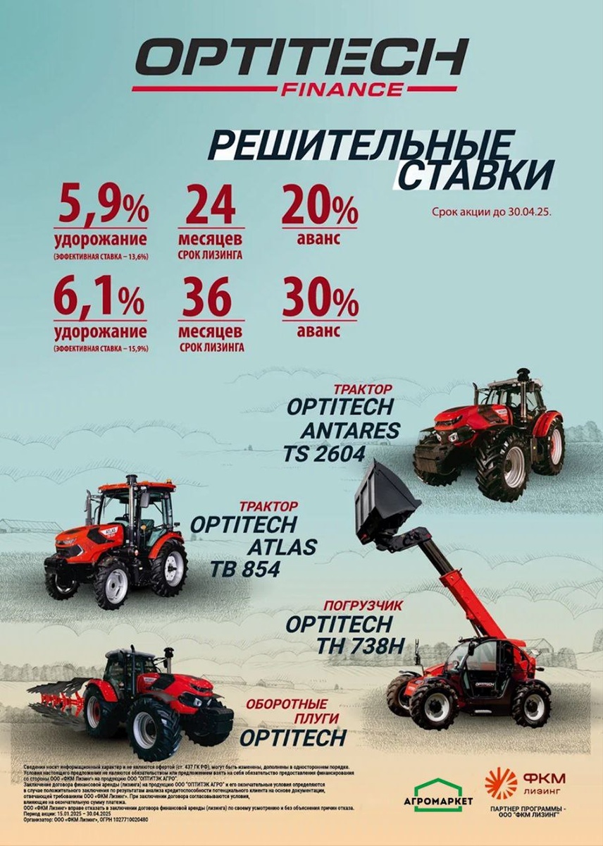 Ставка ЦБ 21% усложнила кредитование сельхозтехники. Но у нас есть решение! С 14 января 2025 года ОПТИТЭК и «ФКМ Лизинг» запускают выгодную лизинговую программу.