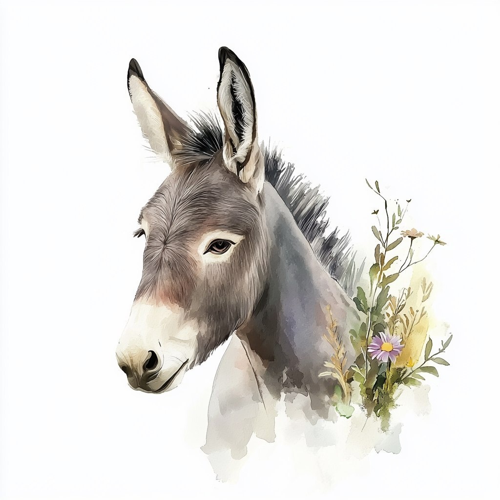 Создано на основе запроса: A donkey in watercolor style, facing slightly left, with soft and muted colors, gray fur with a white muzzle, a single flower tucked behind its ear, surrounded by gentle greenery, white background, artistic and peaceful composition