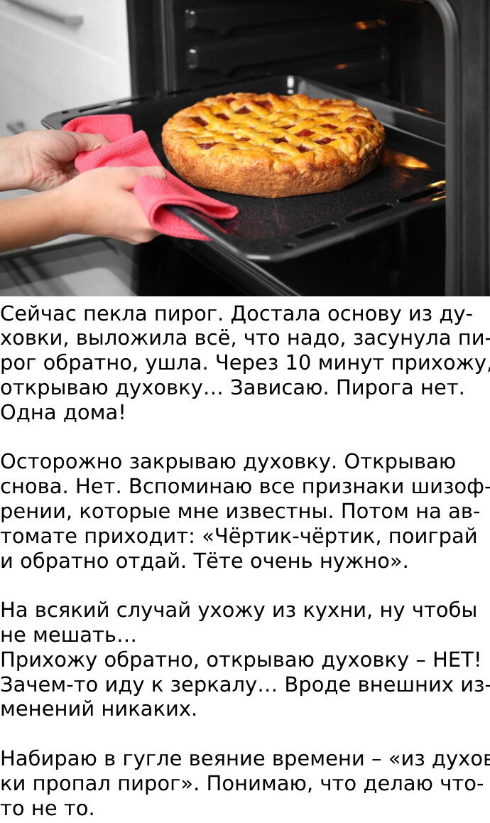 Щипнула себя за руку – реакция есть. Сказала себе: «Лена!Ты взрослая, умная женщина! Ну куда он мог деться?» Подумалось про соседей, привлечённых запахом свежей выпечки. Балкон открыт. Вышла, посмотрела. Не залезть. Иду обратно на кухню, в полном расстройстве психики. Почему-то вспоминаются «Секретные материалы»… Представляю инопланетян, жадно жующих мой пирог в своей тарелке и начинаю ржать… Выпиваю стакан воды. Открываю посудомойку, чтобы поставить пустой стакан. Оттуда изумлённо таращится мой пирог… Дверцы-то рядом… Из Сети ВАШ КЛАСС - ЭТО ЛУЧШАЯ ПОДДЕРЖКА ДЛЯ МЕНЯ ❤ СПАСИБО ЗА ВНИМАНИЕ