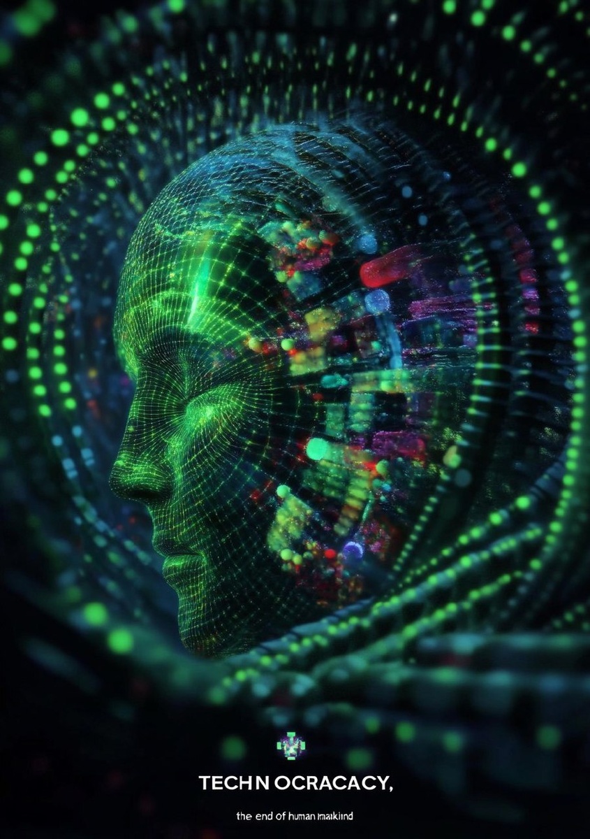 Создано на основе запроса: Movie poster saying "TECHNOCRACY, the end of human mankind", creating a twisting energy tunnel with tunderbolt xrax lightrays meeting in the middle for the big impact, robotic arms, art by ChrisWaikikiAI