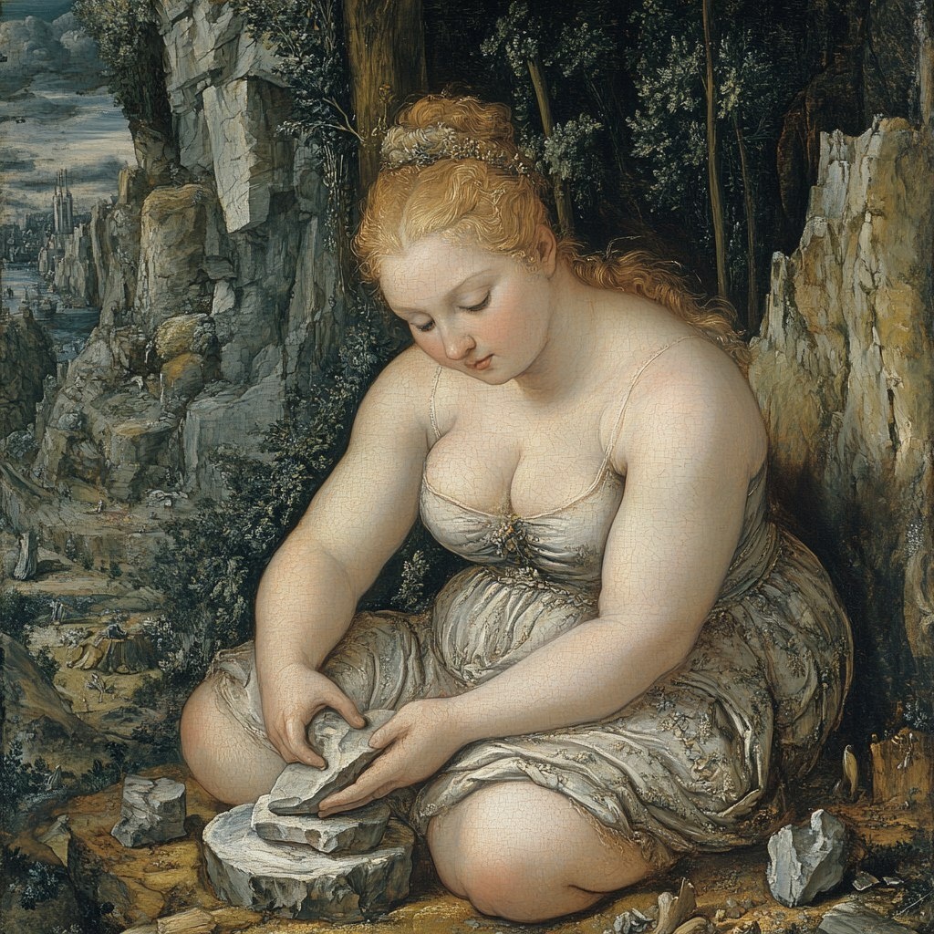 Создано на основе запроса: Venus literally sculpting herself from marble, her bottom half is still a block of stone in a quarry while the top part is already finished, a painting in light tones by Rubens