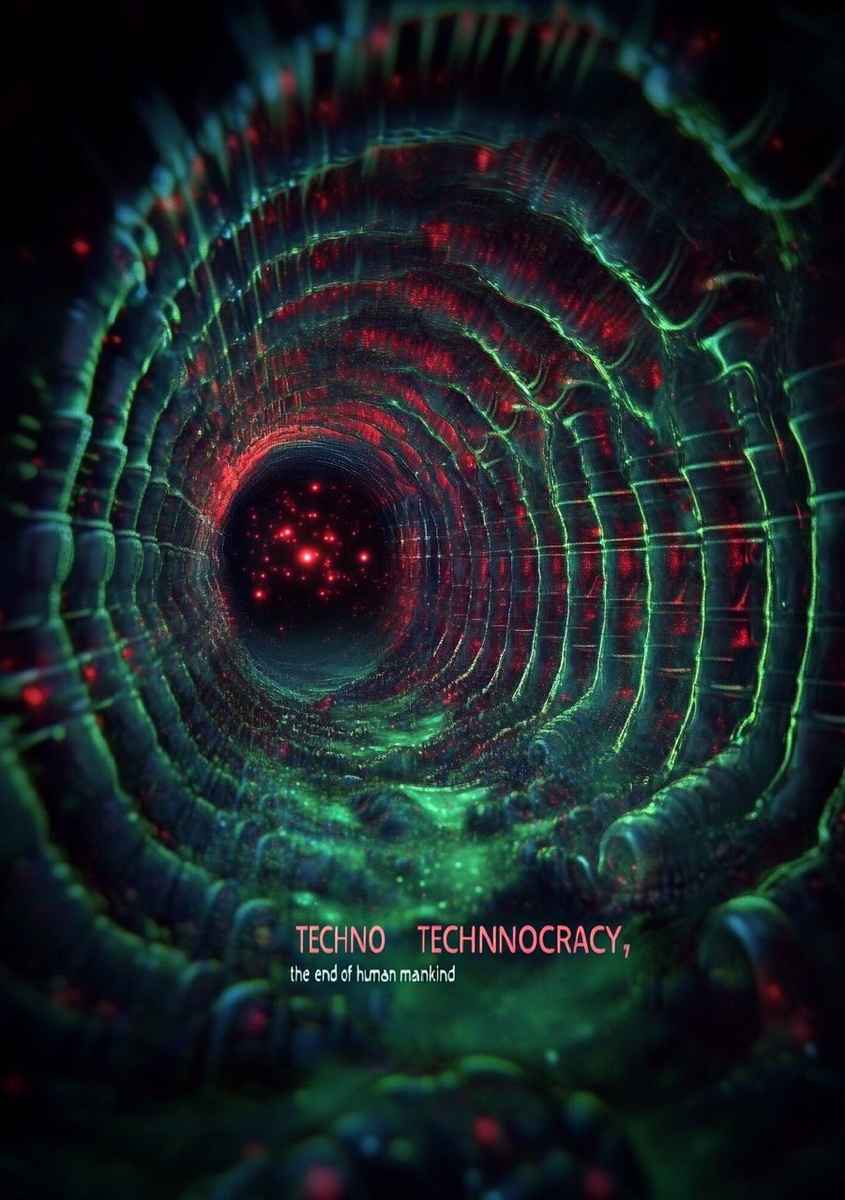 Создано на основе запроса: Movie poster saying "TECHNOCRACY, the end of human mankind", creating a twisting energy tunnel with tunderbolt