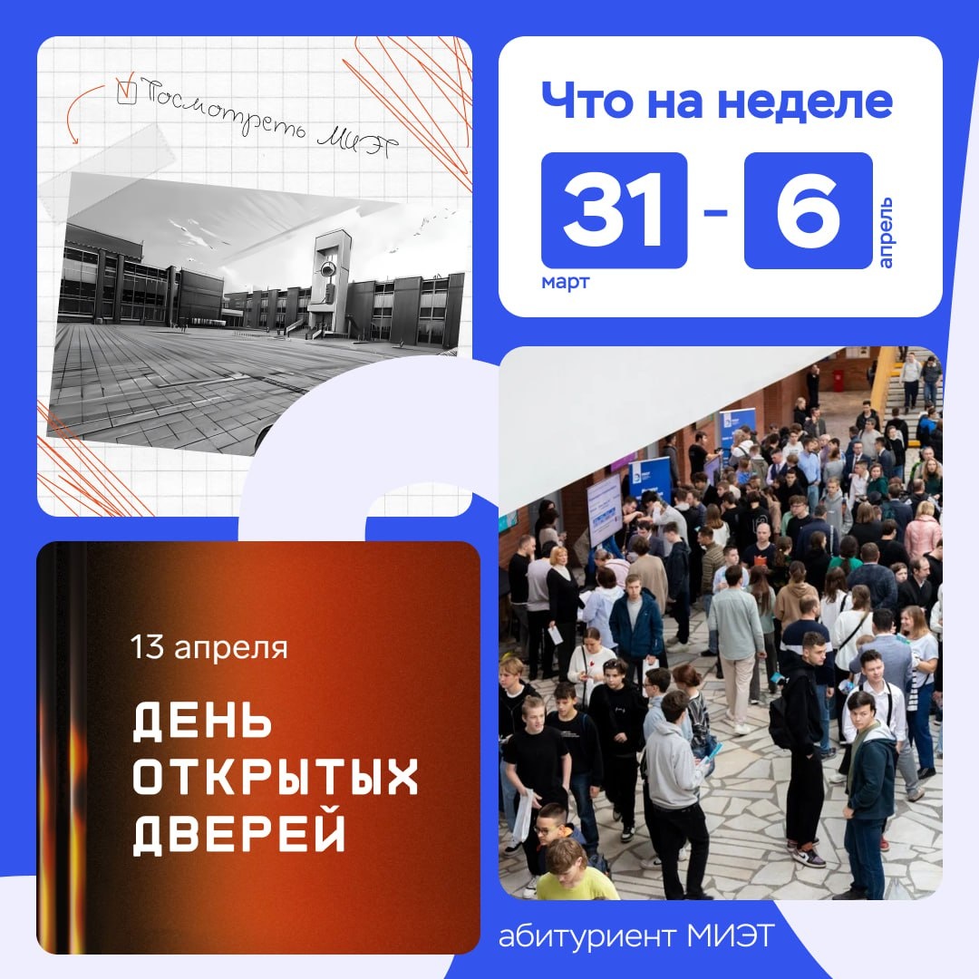👋 Привет, абитуриент! НИУ МИЭТ регулярно проводит мероприятия, интересные школьникам разных возрастов. Делимся списком ближайших: 🔸 День открытых дверей 13 апреля состоится весенний День открытых дверей для поступающих в бакалавриат, специалитет и программы среднего профессионального образования. Регистрация 🔹 Будущее науки и технологий 31 марта стартует прием проектных работ в рамках конкурса «Будущее науки и технологий». К участию приглашаются учащиеся 7-11 классов. Первый этап продлится до 28 апреля. Призеры и победители конкурса из числа старшеклассников получат 6 и 8 баллов индивидуальных достижений соответственно при поступлении в НИУ МИЭТ. Регистрация 🔸 Вебинары Приёмной комиссия МИЭТ Ближайший вебинар пройдет 1 апреля в 19:00 и будет посвящен теме «Алгоритм поступления после школы в вуз: раскладываем весь процесс по полочкам» Регистрация 🔹 Еженедельные экскурсии по направлениям подготовки Ближайшая экскурсия пройдет 4 апреля в 16:00 по направлениям подготовки: 40.05.01