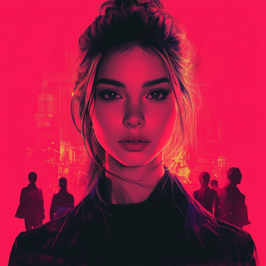 Автоперевод: Иллюстрация с темой красивой женщины имеет комбинацию фигур, стоящих за ней, и на вершине есть очевидные слова.