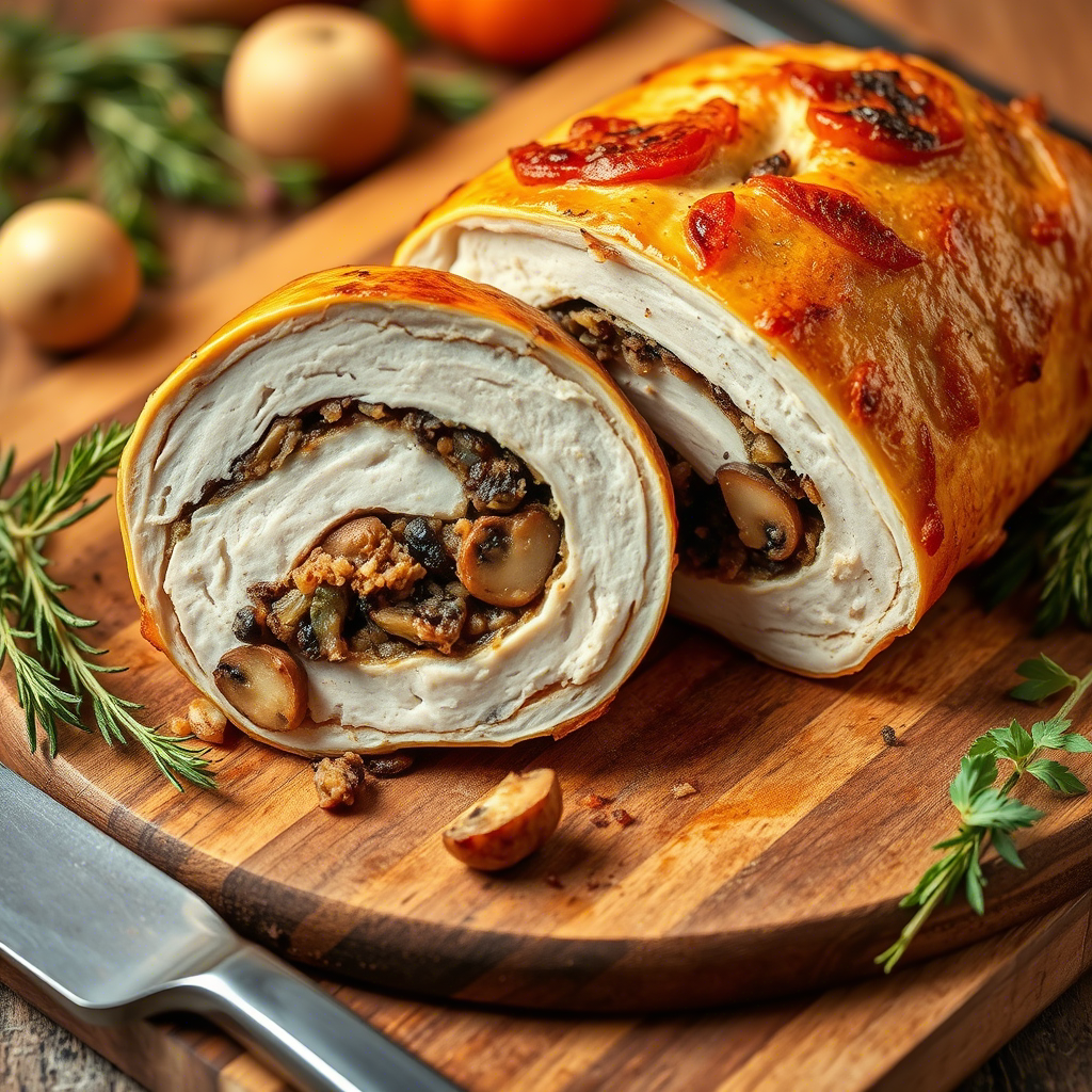 Это блюдо выглядит эффектно, подходит для праздничного стола и порадует всех гостей своим вкусом. Нежное мясо индейки в сочетании с ароматной грибной начинкой — это идеальный выбор для компании из 5 человек. Готовится за 1,5–2 часа, но результат того стоит!