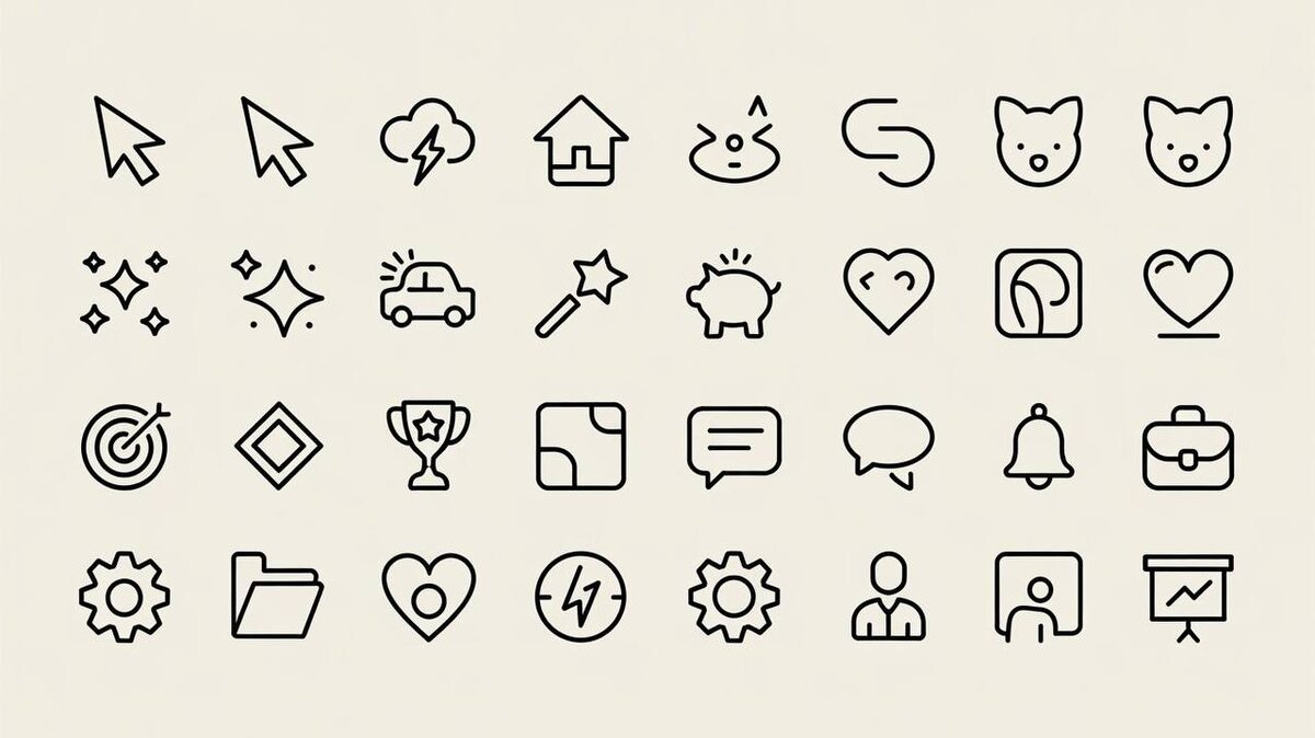 А вот еще немного магии. Теперь это не инфографика, а иконки в линейном стиле. A collection of 30 minimalist black line art icons arranged in a 6x5 grid on a light background. The icons are arranged in 3 rows of 10 icons each. The top row includes a mouse cursor arrow, a cloud with a lightning bolt, a house silhouette, a mouse tail, and a cat face. The middle row contains sparkle stars, a car, a magic wand, a piggy bank, and a heart. The bottom row shows a target with arrows, a trophy, a square with curved corners, a speech bubble, a bell, and a briefcase. Additional icons include a gear, a folder, a heart with lightning bolt, a settings cog, a user profile, and a presentation slide. Each icon is designed with clean lines and simple shapes, maintaining consistent thickness and style throughout the set. The icons are arranged with equal spacing between them, creating a balanced and organized layout. Приложил промпт для тех, кто хочет попробовать в ideogram 3.0 попробовать создать икон
