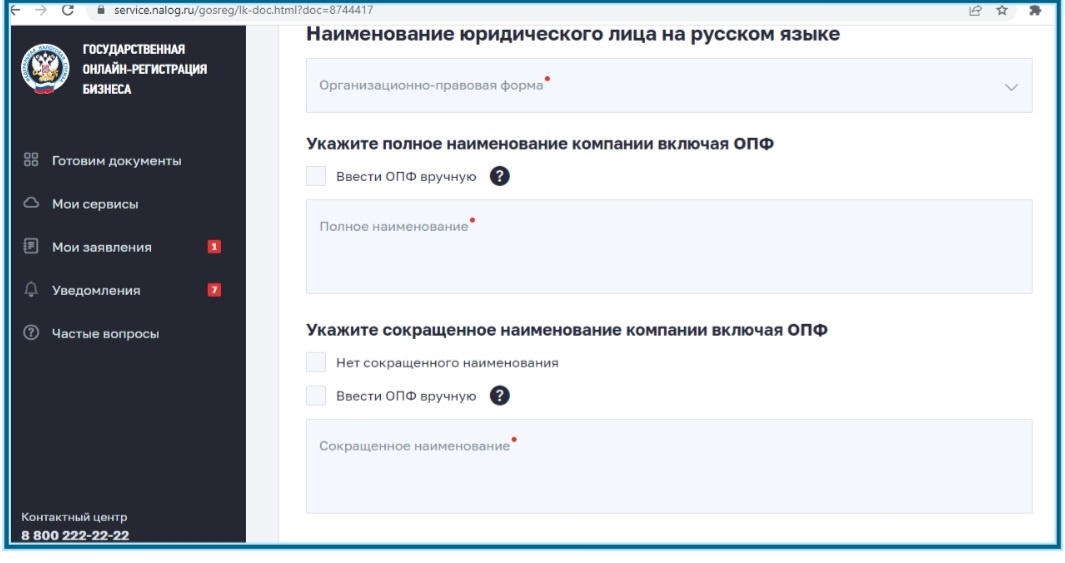 Выбираем организационно-правовую форму, чаще всего используют общество с ограниченной ответственностью. Вводим полное наименование организации, сокращенное. Адрес регистрации может быть адрес помещения, которое вы выбрали под ваш бизнес или юридический адрес регистрации директора как физического лица (прописка).
