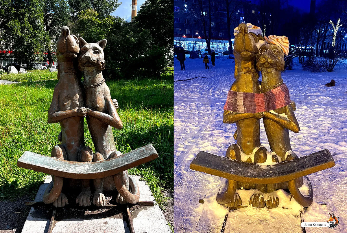 Я уже писала об этой жанровой скульптуре в виде скамейки примирения. А сегодня хочу показать, как по-разному может выглядеть один и тот же объект в разное время года.