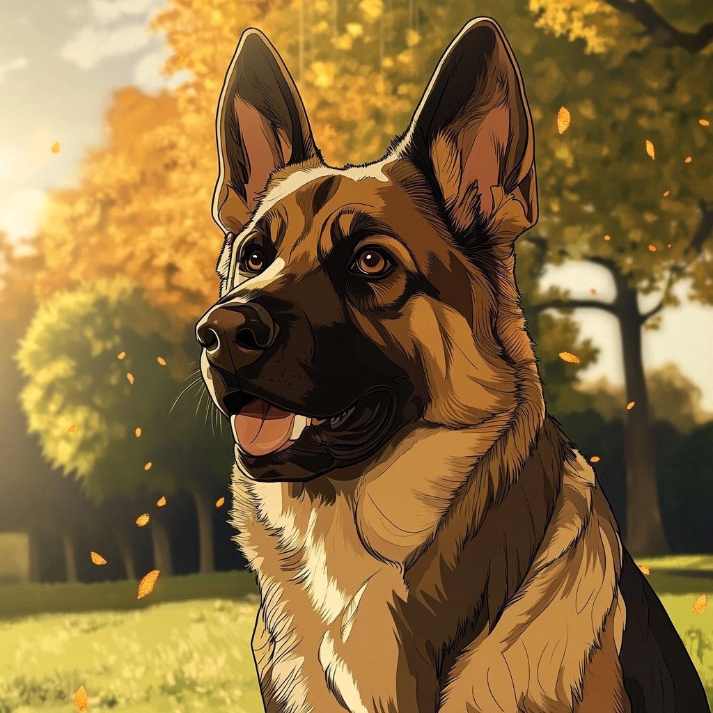 Создано на основе запроса: Anime style German shepherd dog. Park background
